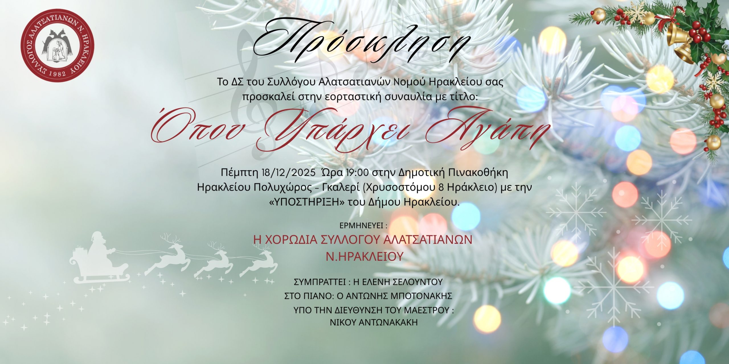 Χριστούγεννα στην Πόλη: Συναυλία από τον Σύλλογο Αλατσατιανών Ν. Ηρακλείου: «Όπου Υπάρχει Αγάπη»