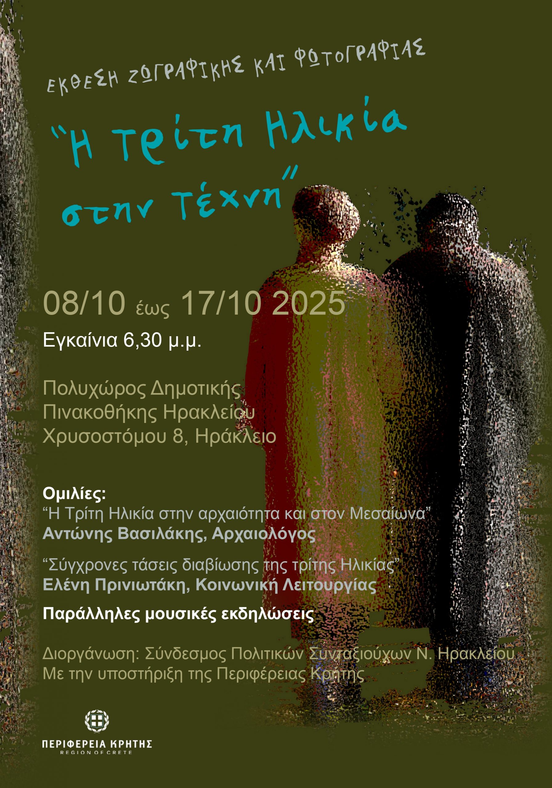 Ο Σύνδεσμός Πολιτικών Συνταξιούχων, διοργανώνει με την υποστήριξη της Περιφέρειας Κρήτης, Έκθεση Ζωγραφικής και Φωτογραφίας με θέμα: «Η Τρίτη Ηλικία στην Τέχνη».