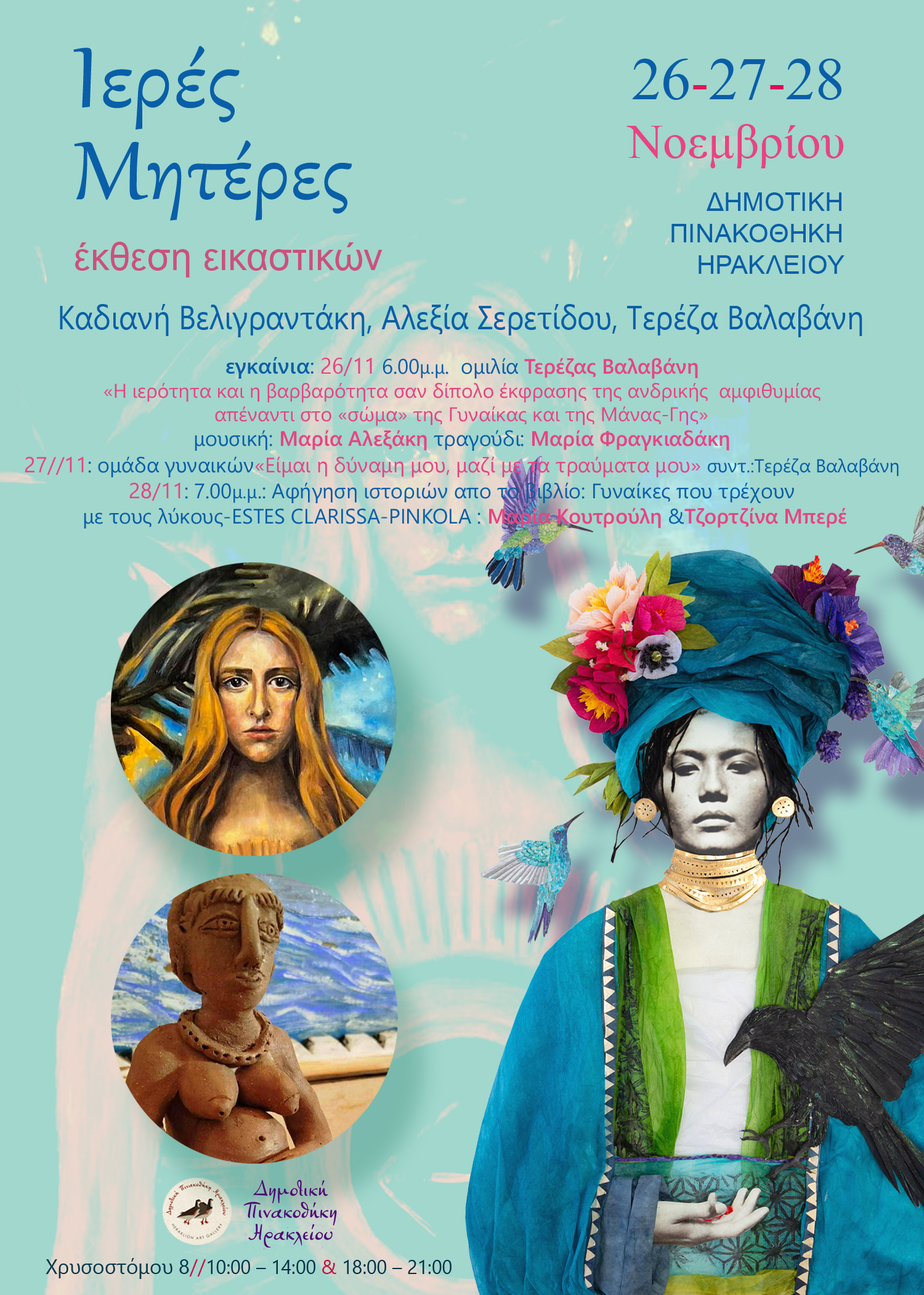 Η εικαστική έκθεση “Ιερές Μητέρες” στη Δημοτική Πινακοθήκη Ηρακλείου, Χρυσοστόμου 8, είναι αφιερωμένη στην θηλυκή ενέργεια, που ρέει παντού σε όλους τους κόσμους και τα σύμπαντα, αναγεννώντας και ιαίνοντας.