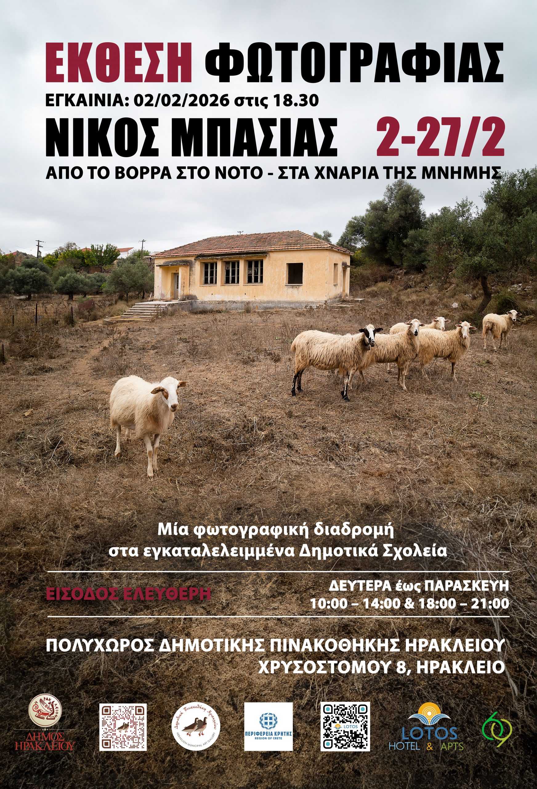 Ο Πολυχώρος – Γκαλερί της Δημοτικής Πινακοθήκης Ηρακλείου παρουσιάζει την ατομική έκθεση του βραβευμένου σε διεθνές και εθνικό επίπεδο φωτογράφου και εικαστικού Νίκου Μπασιά, ένα μοναδικό ταξίδι στον χώρο και τον χρόνο των δημοτικών σχολείων που σφράγισαν γενιές. Με τίτλο «Από τον Βορρά στον Νότο – Στα Χνάρια της Μνήμης», η έκθεση περιλαμβάνει φωτογραφίες από δημοτικά σχολεία σε όλη την Ελλάδα, την Κύπρο και τη Σμύρνη, χαρτογραφώντας την ιστορία και τη μνήμη μέσα από τα κτίρια που αποτέλεσαν κέντρα κοινότητας και εκπαίδευσης.